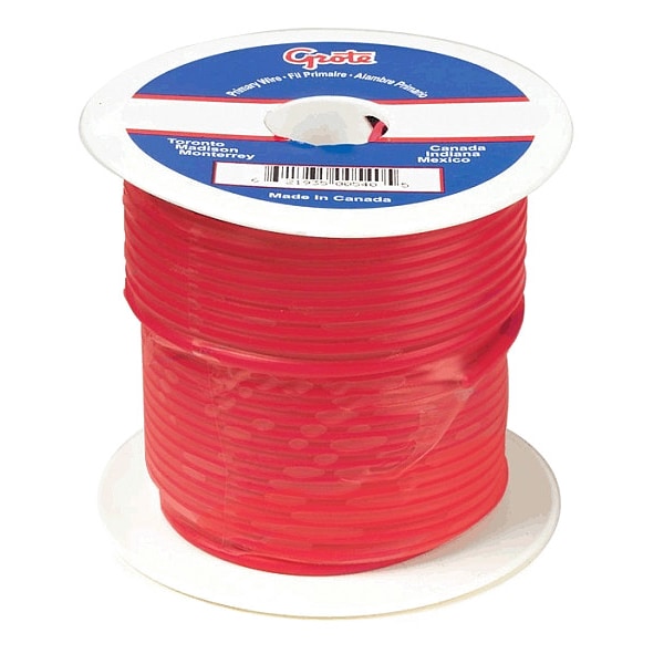 Primary Automotive Wire, Number of Conductors 1, Wire Size 6 AWG, Insulation Material PVC, Wire Color Red, Length 25 ft, Voltage 60 V, Trade Designation GPT, Conductor Design Stranded, Jacket Color Not Applicable, Conductor Material Copper