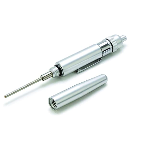 Manufactured from solid Aluminium with a steel needle.
