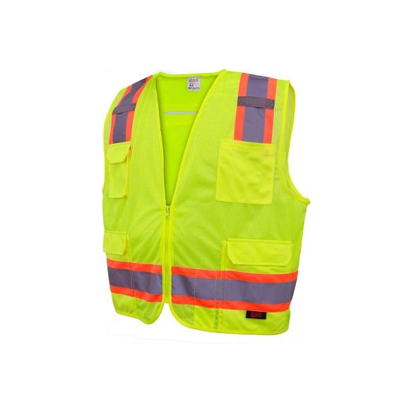 features: zipper closure 2" silver reflective tape with contrasting trim 100% polyester mesh with solid knit pockets 6 pockets: 4 outside with 2 inside 1503-lime certification: ansi/isea 107-2010