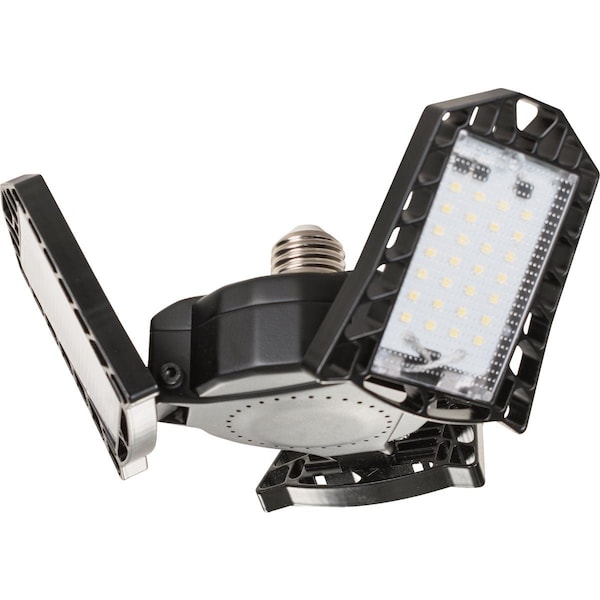 High-intensity replacement LED light bulb. High-lumen light output bulb featuring 3 adjustable panels. Fold the panels flat for focused downlighting or tilt them up for specific light placement and area lighting. Sturdy construction makes it ideal for garages barns warehouses large offices and other high-traffic locations. Easy to install with standard E26 base.