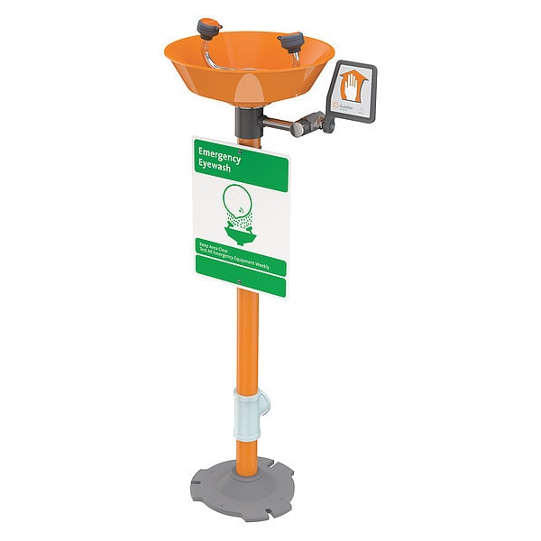 Plumbed Eyewash, Activation Push Plate, Barrier Free No, Bowl Style Uncovered, Color Orange, Coverage Eyes, Depth 11 1/2 in, Height 38 in, Width 16 in, Environment General Purpose, Eyewash Bowl Material Plastic, Hazardous Location Rating Not Rated, Includes Hi-Visibility Identification Sign, Inspection Tag, Nylon Flip-Top Dust Cover, Includes Drench Hose No, Includes Foot Pedal No, Inlet Pipe Gender Female, Inlet Pipe Size 1/2 in, Inlet Pipe Thread Type NPT, Pipe Material Galvanized Steel