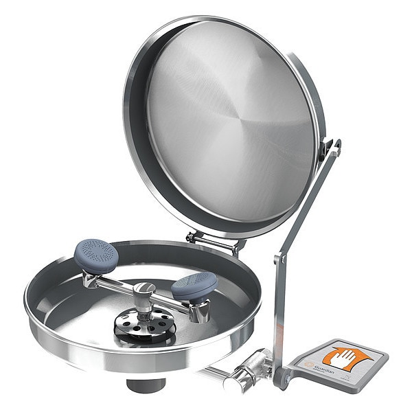 Plumbed Eyewash, Activation Push Plate, Barrier Free No, Bowl Style Covered, Color Silver, Coverage Eyes and Face, Depth 13 3/4 in, Height 9 1/2 in, Width 15 1/2 in, Environment General Purpose, Eyewash Bowl Material Stainless Steel, Hazardous Location Rating Not Rated, Includes Hi-Visibility Identification Sign, Inspection Tag, Stainless Steel Hinged Dust Cover, Includes Drench Hose No, Includes Foot Pedal No, Inlet Pipe Gender Female, Inlet Pipe Size 1/2 in, Inlet Pipe Thread Type NPT