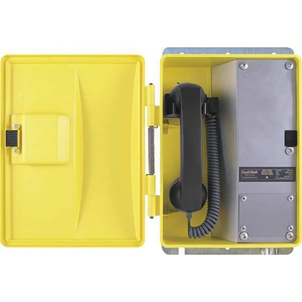 Ringdown Telephone, Overall Depth 4 in, Overall Height 14 in, Overall Width 8 3/4 in, Volume Control Yes, Indoor/Outdoor Usage Indoor, Outdoor, Standards CSA Certified, FCC TCB, Industry Canada 10124041A, Number of Handsets 1, Number of Lines 1, Cord Length 20 ft, Mounting Location Wall, Enclosure Material Steel, Enclosure Rating NEMA 3R, Includes Enclosure Yes, Includes Mounting Hardware Yes, Maximum Operating Temperature 140 Degrees F, Minimum Operating Temperature -40 Degrees F, Color Yellow