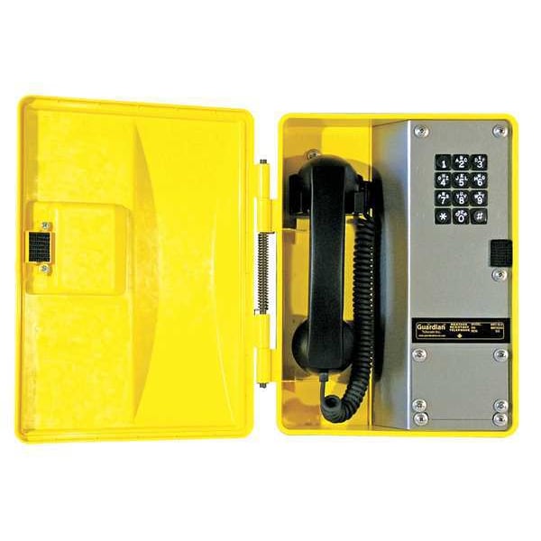 Weather Resistant Telephone, Overall Depth 3 7/8 in, Overall Height 12 in, Overall Width 8 3/4 in, Volume Control Yes, Indoor/Outdoor Usage Outdoor, Standards FCC TCB, Number of Handsets 1, Number of Lines 1, Cord Length 20 ft, Mounting Location Wall, Enclosure Material Steel, Enclosure Rating NEMA 3R, Includes Enclosure Yes, Facility Type Commercial, Maximum Operating Temperature 176 Degrees F, Minimum Operating Temperature -76 Degrees F, Color Yellow