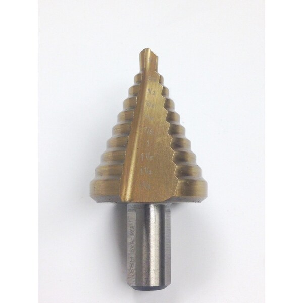 1/4-1-3/8" TiN Coated High Speed Steel Step Drill with 10 Steps ~ Step depth is 1/8". ~ Shank is 1/2". ~ Heat treated and tempered for maximum strength. ~ Requires no center punch to start drilling. ~ Automatically deburrs drilled hole.