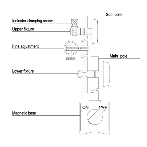 Dasqua 132 Lbs Magnetic Force Magnetic Base With Fine Adjustment ~ High quality, reliable base. ~ V-grooved base for ease of mount on cylindrical parts. ~ Chrome plated rods. ~ Horizontal or vertical positioning capabilities. ~ Black wrinkled finish on non-working surfaces. ~ High quality permanent magnet. ~ Smooth and easy on/off switch. ~ Base is 60mm (2.36") x 50mm (1.97") x 55mm ( 2.17"). ~ Main rod is 12mm (.47") diameter x 176mm (6.93"). ~ 2nd rod is 10mm diameter (.39")x 150mm (5.91"). ~ Clamp hole diameters are 6mm (.24"), 8mm (.31") & 3/8".