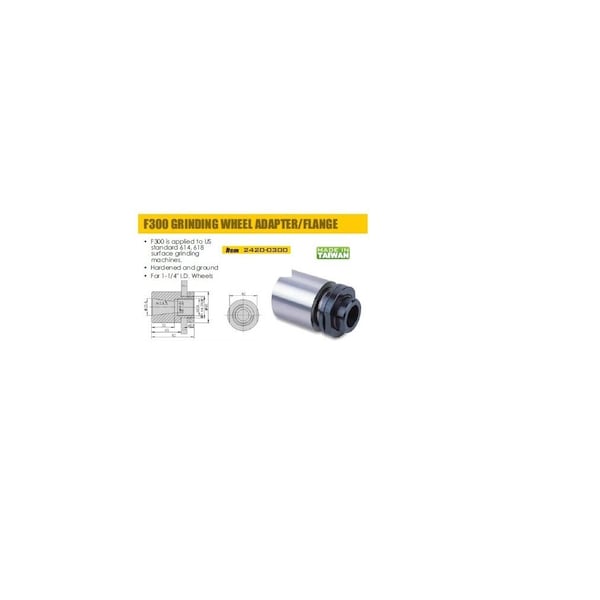 F300 Grinding Wheel Adapter ~ This is used with US standard 614 & 618 surface grinding machines. ~ Hardened to HRC20-25 and ground. ~ For 1-1/4" I.D. grinding wheels. ~ Made in Taiwan.