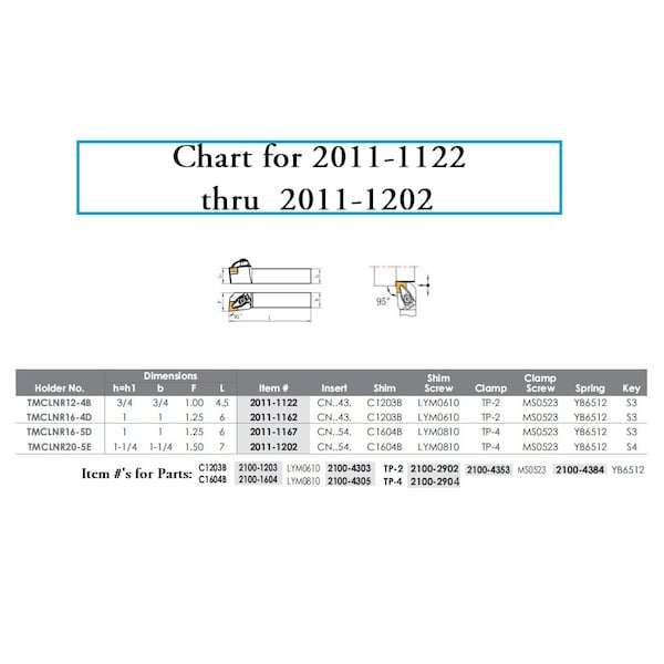 MCLNR 20-5E Turning & Facing Tool Holder - New Rigid Clamp Design (2011-1202) ~ Right hand. ~ Reverse 5 degree lead angle for turning and facing. ~ Zero degree relief. ~ New rigid style top & hole clamping design provides increased stability & security for productive turning of large components and heavy machining. ~ Use with CNMA, CNMG or CNMM inserts. ~ Please see chart picture for sizing information.