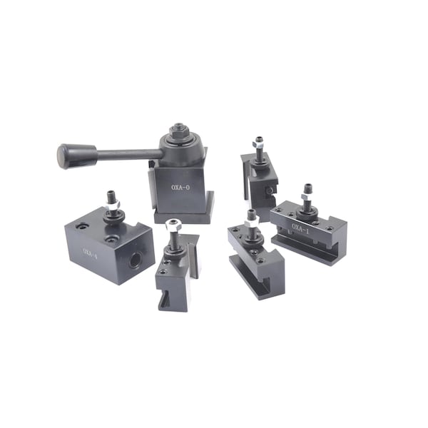 Mini 3048 Quick Change Tool Post & Holder Set (0XA) ~ Swing capacity up to 9". ~ This true wedge type tool post set provides maximum rigidity and chatter free performance. ~ All working parts are hardened and ground. ~ It is completely sealed for maintenance-free operation. ~ It requires 3/4" from the top of the compound rest to the center of the lathe. ~ This lathe quick change pool post set includes a 4-degree cut-off tool holder. ~ The tool post is 60% of an AXA or series 100 size wedge type tool post. ~ This tool post mounts with an M10 stud that is included. ~ It also includes a piece of steel from which you can make a T-slot nut to fit your lathe. ~ Made of steel. ~ Holds turning tools with shanks from 1/4" to 1/2". ~ The boring bar holder will hold 3/8" and 1/2" boring bars. ~ It will hold 1/2" tall cut-off blades. ~ Kit includes a tool post, 2 No. 1 turning & facing tool holders, a No. 2 boring turning & facing tool holder, a No. 4 heavy duty boring tool holder, a No. 7 universal parting tool holder.