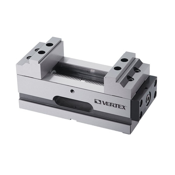 Vertex 4" Self-Centering CNC Vise ~ Reversable jaw. ~ Suitable for 4 or 5 axis CNC machines. ~ Repeat clamping tolerance is +/-0.0004"/0.01mm. ~ FCD 60 high tension cast iron slide way has a hardness of HRC 45. ~ Interchangeable jaw heat treated to HRC 50. ~ Lock down design to keep work piece from lifting. ~ Jaw depth is 1.57". ~ Jaw width is 3.98". ~ Jaw opening is 5.2". ~ Clamping capacity is 2.44-7.56". ~ Maximum clamping force is 400 kgf. ~ Torque for clamping is 2.6m/kgf.