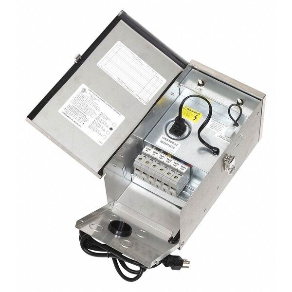 Transformer, Input Voltage 120V AC, Output Voltage Selectable 12, 13, 14, or 15V AC, Max. Wattage 600, NEMA Plug Configuration 5-15P, Enclosure Material Stainless Steel, Color Silver, Height 12.50 in, Width 6.75 in, Depth 6.2 in, Standards ETL, cETL Listed, NEMA 3R Rated