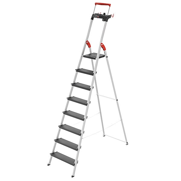 Platform Stepladder, Material Aluminum, ANSI Type Not Rated, Ladder Height 8 ft 3 in, Load Capacity 330 lb, Number of Steps 8, Base Spread 57.9 in, Bottom Width 56 cm, Step Depth 5.1 in, Step Tread Ribbed, Series L100, Includes Locking Platform, Tool Tray, Standards EN-131, Rung/Step Spacing 8 1/2 in
