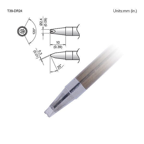 Soldering Tip, Tip Series T39, Tip Width 2.4 mm, Tip Length 10 mm, Maximum Operating Temperature 850 Degrees F, Compatible Handpiece Manufacturer Model Number FX-9701, FX-9702, Tip Outside Diameter 0.09 in, Tip Thickness 0.3 mm, Tip Angle 25 Degrees , Tip Connection Type Plug, Compatible Station FX-971, Compatible Handpiece Manufacturer Hakko, Material Composite, Overall Length 4 3/64 in, Product Type Soldering Tip