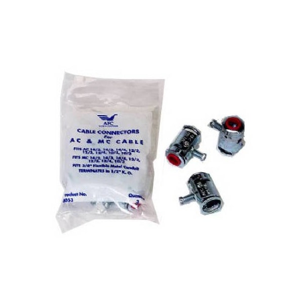 3 Pack, 12 AFC50 MC Flexible Metal Cable Box Connector, Unique No Locknut Design With Insulated Throat 4 Way Screw, Use For Steel Or Aluminum AC Or MC Cable, 142 Thru 124, UL CSA, Poly Bag