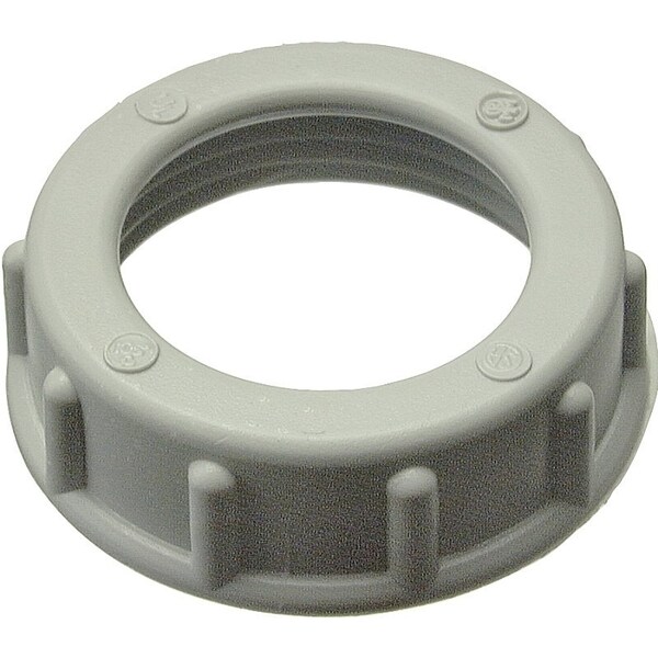 High impact thermoplastic. Flame retardant to 105 deg C. Use with locknut to terminate threaded Rigid or IMC conduit to an outlet box. The rounded surface of the bushing prevents damage to wire insulation. Required by the NEC. UL listed and CSA approved.