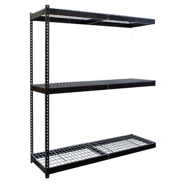 Boltless Shelving, Angle, Overall Depth 30 in, Overall Height 84 in, Overall Width 48 in, Shelf Gauge 4 ga, Shelf Adjustment Increments 1 1/2 in, Steel, Steel, Steel, Center Support, Includes Decking Yes, 550 lb, Whole Unit Load Capacity 1,650 lb, Add-On, Open, Greenguard Certified, Post Gauge 14 ga, Number of Shelves 3, Floor Mount, Maximum Post Load Capacity 1,650 lb with Beams Evenly Spaced at 42 in, Powder Coated, Medium-Duty, Black