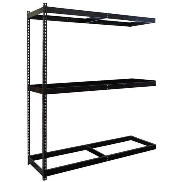Boltless Shelving, Angle, Overall Depth 36 in, Overall Height 84 in, Overall Width 96 in, Shelf Gauge 16 ga, Shelf Adjustment Increments 1 1/2 in, Steel, None, Steel, Center Support, Includes Decking No, 620 lb, Whole Unit Load Capacity 1,860 lb, Add-On, Open, Greenguard Certified, Post Gauge 14 ga, Number of Shelves 3, Floor Mount, Maximum Post Load Capacity 1,860 lb with Beams Evenly Spaced at 42 in, Powder Coated, Medium-Duty, Black