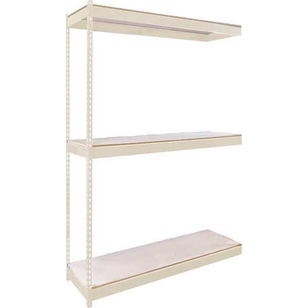 Boltless Shelving, Angle, Overall Depth 36 in, Overall Height 84 in, Overall Width 48 in, Shelf Gauge 16 ga, Shelf Adjustment Increments 1 1/2 in, Steel, Particleboard, Steel, Decking, Includes Decking Yes, Includes Mounting Hardware No, 400 lb, Whole Unit Load Capacity 1,200 lb, Add-On, Open, Post Gauge 14 ga, Number of Shelves 3, Floor Mount; Wall Mount, Maximum Post Load Capacity 1,200 lb with Beams Evenly Spaced at 42 in, Powder Coated, Light-Duty, Tan