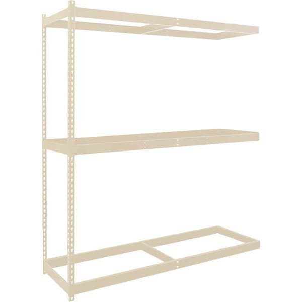 Boltless Shelving, Channel, Overall Depth 36 in, Overall Height 84 in, Overall Width 96 in, Shelf Gauge 14 ga, Shelf Adjustment Increments 1 1/2 in, Steel, None, Steel, Center Support, Includes Decking No, Includes Mounting Hardware No, 1,400 lb, Whole Unit Load Capacity 4,200 lb, Add-On, Open, Post Gauge 14 ga, Number of Shelves 3, Floor Mount; Wall Mount, Maximum Post Load Capacity 2,130 lb with Beams Evenly Spaced at 42 in, Powder Coated, Heavy-Duty, Tan