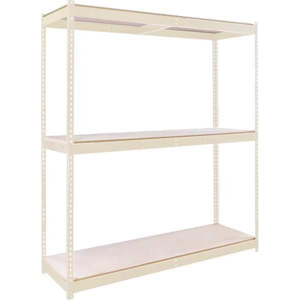 Boltless Shelving, Channel, Overall Depth 36 in, Overall Height 84 in, Overall Width 96 in, Shelf Gauge 16 ga, Shelf Adjustment Increments 1 1/2 in, Steel, Particleboard, Steel, Center Support, Includes Decking Yes, Includes Mounting Hardware No, 710 lb, Whole Unit Load Capacity 2,130 lb, Starter, Open, Post Gauge 14 ga, Number of Shelves 3, Floor Mount; Wall Mount, Maximum Post Load Capacity 2,130 lb with Beams Evenly Spaced at 42 in, Powder Coated, Heavy-Duty, Tan