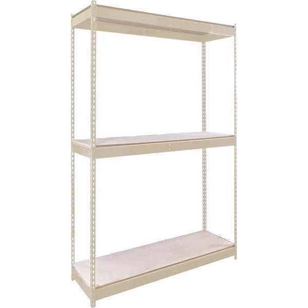 Boltless Shelving, Angle, Overall Depth 48 in, Overall Height 84 in, Overall Width 48 in, Shelf Gauge 16 ga, Shelf Adjustment Increments 1 1/2 in, Steel, Particleboard, Steel, Decking, Includes Decking Yes, Includes Mounting Hardware No, 275 lb, Whole Unit Load Capacity 825 lb, Starter, Open, Post Gauge 14 ga, Number of Shelves 3, Floor Mount; Wall Mount, Maximum Post Load Capacity 825 lb with Beams Evenly Spaced at 42 in, Powder Coated, Light-Duty, Tan