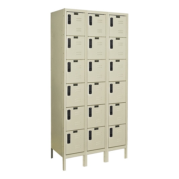 Box Locker, Audit Trail Storage None, Frame Assembled Unassembled, Number of Tiers 6, Number of Units Wide 3, Door Type Louvered, Frame Material Thickness 16 ga, Includes Number Plates Yes, Locker Color Tan, Lock Type Electronic Keypad, Overall Depth 12 in, Overall Height 78 in, Overall Width 36 in, Handle Type Pull, Locker Material Steel, Number of Lockers 18, Opening Depth 11 in, Opening Height 11 1/2 in, Opening Width 9 1/4 in