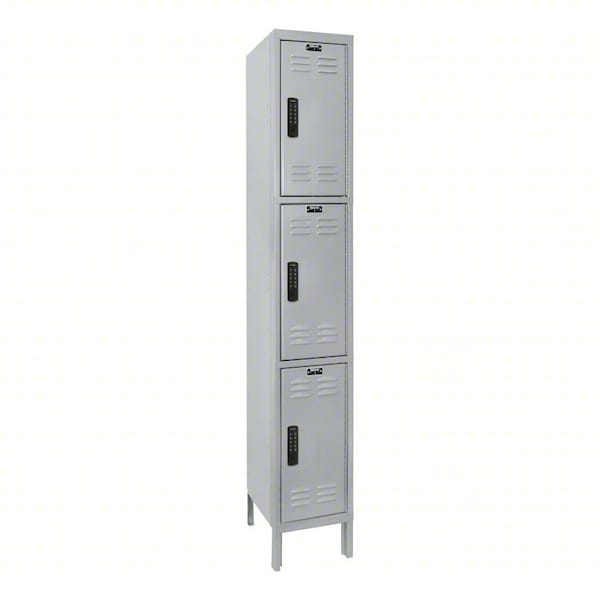 Locker, Audit Trail Storage Not Applicable, Frame Assembled Unassembled, Number of Tiers 3, Number of Units Wide 3, Door Type Louvered, Frame Material Thickness 24 ga, Includes Number Plates Yes, Locker Color Gray, Lock Type 8-Digit Code/Key, Overall Depth 12 in, Overall Height 24 in, Overall Width 12 in, ADA Compliant Yes, Antimicrobial No, Base/Leg Height 6 in, Door Locking Points 1, Handle Type Side Latch, Includes CR123 Battery, Includes Hanging Rod No, Includes Slope Top Panel No