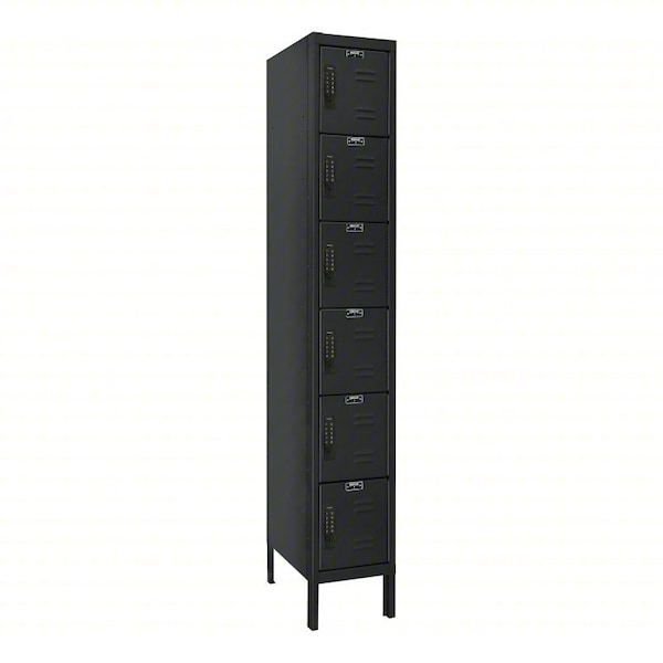 Locker, Audit Trail Storage Not Applicable, Frame Assembled Unassembled, Number of Tiers 6, Number of Units Wide 1, Door Type Louvered, Frame Material Thickness 24 ga, Includes Number Plates Yes, Locker Color Black, Lock Type 8-Digit Code/Key, Overall Depth 12 in, Overall Height 78 in, Overall Width 12 in, ADA Compliant Yes, Antimicrobial No, Base/Leg Height 6 in, Door Locking Points 1, Handle Type Side Latch, Includes CR123 Battery, Includes Hanging Rod No, Includes Slope Top Panel No