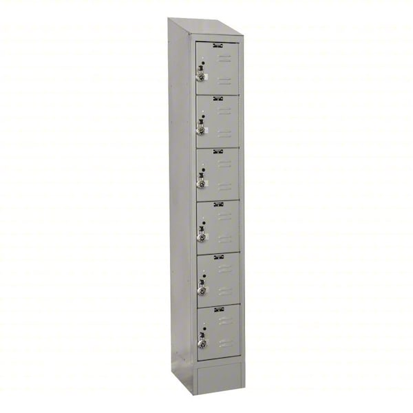 Locker, Audit Trail Storage Not Applicable, Frame Assembled Assembled, Number of Tiers 6, Number of Units Wide 1, Door Type Louvered, Frame Material Thickness 24 ga, Includes Number Plates Yes, Locker Color Gray, Lock Type Combination/Padlock, Overall Depth 12 in, Overall Height 78 in, Overall Width 12 in, ADA Compliant No, Antimicrobial No, Base/Leg Height 6 in, Handle Type Recessed Lift, Includes Padlock Strike Plate, Padlock, Includes Hanging Rod No, Includes Slope Top Panel Yes