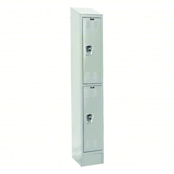Locker, Audit Trail Storage Not Applicable, Frame Assembled Assembled, Number of Tiers 2, Number of Units Wide 1, Door Type Louvered, Frame Material Thickness 24 ga, Includes Number Plates Yes, Locker Color Gray, Lock Type Combination/Padlock, Overall Depth 15 in, Overall Height 78 in, Overall Width 12 in, ADA Compliant No, Antimicrobial No, Base/Leg Height 6 in, Handle Type Recessed Lift, Includes Padlock Strike Plate, Padlock, Includes Hanging Rod No, Includes Slope Top Panel Yes