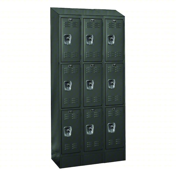 Locker, Audit Trail Storage Not Applicable, Frame Assembled Assembled, Number of Tiers 3, Number of Units Wide 3, Door Type Louvered, Frame Material Thickness 24 ga, Includes Number Plates Yes, Locker Color Black, Lock Type Combination/Padlock, Overall Depth 15 in, Overall Height 78 in, Overall Width 12 in, ADA Compliant No, Antimicrobial No, Base/Leg Height 6 in, Handle Type Recessed Lift, Includes Padlock Strike Plate, Padlock, Includes Hanging Rod No, Includes Slope Top Panel Yes