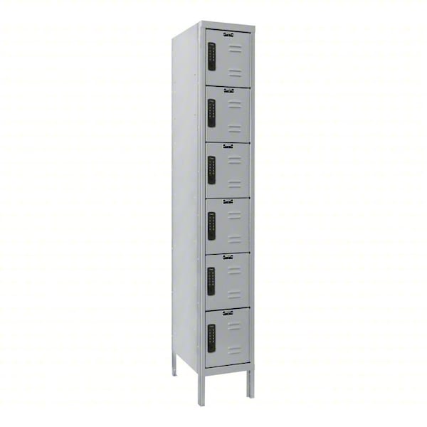 Locker, Audit Trail Storage Not Applicable, Frame Assembled Unassembled, Number of Tiers 6, Number of Units Wide 1, Door Type Louvered, Frame Material Thickness 24 ga, Includes Number Plates Yes, Locker Color Gray, Lock Type 8-Digit Code/Key, Overall Depth 18 in, Overall Height 12 in, Overall Width 12 in, ADA Compliant Yes, Antimicrobial No, Base/Leg Height 6 in, Door Locking Points 1, Handle Type Side Latch, Includes CR123 Battery, Includes Hanging Rod No, Includes Slope Top Panel No