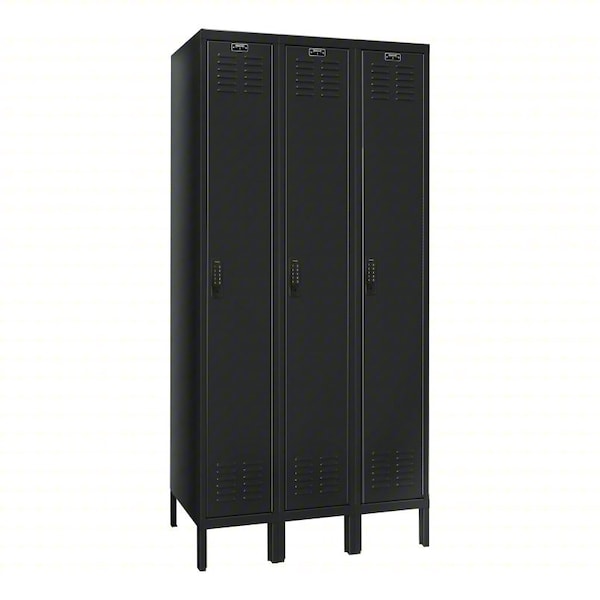 Locker, Audit Trail Storage Not Applicable, Frame Assembled Unassembled, Number of Tiers 1, Number of Units Wide 3, Door Type Louvered, Frame Material Thickness 24 ga, Includes Number Plates Yes, Locker Color Black, Lock Type 8-Digit Code/Key, Overall Depth 18 in, Overall Height 72 in, Overall Width 12 in, ADA Compliant Yes, Antimicrobial No, Base/Leg Height 6 in, Door Locking Points 1, Handle Type Side Latch, Includes CR123 Battery, Includes Hanging Rod No, Includes Slope Top Panel No