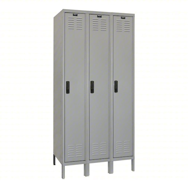 Locker, Audit Trail Storage Not Applicable, Frame Assembled Unassembled, Number of Tiers 1, Number of Units Wide 3, Door Type Louvered, Frame Material Thickness 24 ga, Includes Number Plates Yes, Locker Color Gray, Lock Type 8-Digit Code/Key, Overall Depth 18 in, Overall Height 72 in, Overall Width 12 in, ADA Compliant Yes, Antimicrobial No, Base/Leg Height 6 in, Door Locking Points 1, Handle Type Side Latch, Includes CR123 Battery, Includes Hanging Rod No, Includes Slope Top Panel No
