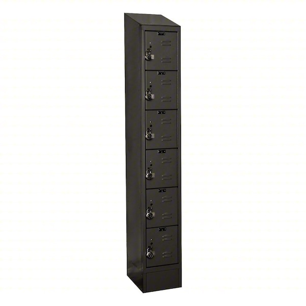 Locker, Audit Trail Storage Not Applicable, Frame Assembled Assembled, Number of Tiers 6, Number of Units Wide 1, Door Type Louvered, Frame Material Thickness 24 ga, Includes Number Plates Yes, Locker Color Black, Lock Type Combination/Padlock, Overall Depth 18 in, Overall Height 78 in, Overall Width 12 in, ADA Compliant No, Antimicrobial Yes, Base/Leg Height 6 in, Handle Type Recessed Lift, Includes Padlock Strike Plate, Padlock, Includes Hanging Rod No, Includes Slope Top Panel Yes