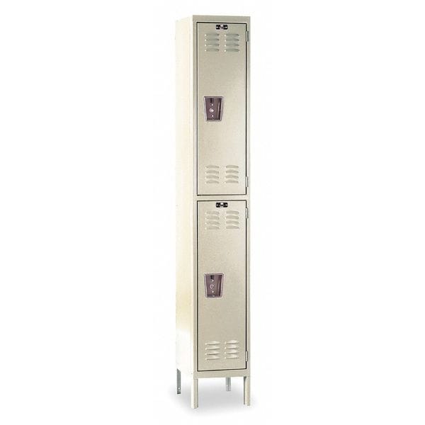Wardrobe Locker, Audit Trail Storage None, Frame Assembled Unassembled, Number of Tiers 2, Number of Units Wide 1, Door Type Louvered, Frame Material Thickness 16 ga, Includes Number Plates Yes, Locker Color Tan, Lock Type Padlock Hasp, Overall Depth 12 in, Overall Height 66 in, Overall Width 12 in, Handle Type Recessed Lift, Includes Number Plate, Locker Finish Powder Coated, Locker Material Steel, Number of Lockers 2, Opening Depth 11 in, Opening Height 28 in, Opening Width 9 1/4 in