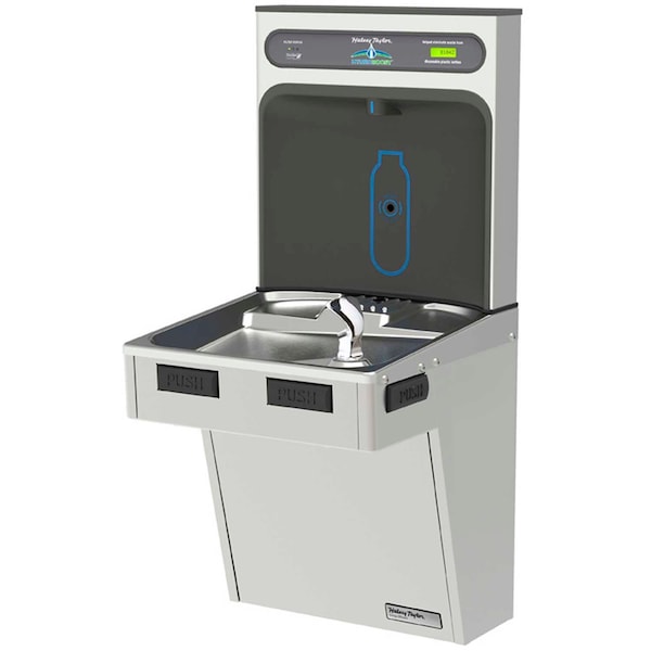 The Halsey Taylor HTHB-HAC8 HYDROBOOST Bottle Filling Station is a self-contained, wall-mounted, single unit that delivers chilled drinking water. Exclusive one-piece, chrome-plated twostream Double Bubbler with non-removable anti-squirt feature and integral hood. Automatic stream height regulator is located inside unit to prevent tampering. A constant stream height is automatically maintained under line pressures that vary from 20 to 105 psi. Includes self-closing, light touch front and side pushbar actuation with raised letters for the visually impaired. Non-corrosive Type 300 series stainless steel cooler top with satin finish resists stains. Basin includes anti-splash ridge and contoured to insure proper drainage.