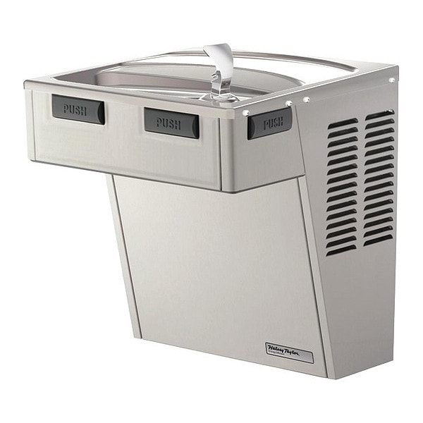 Single Drinking Fountain, Station Type Single Fountain, Fountain Actuation Front Pushbar/Side Pushbar, Includes Water Filter Water Filter Included, ADA Compliant ADA Compliant, Cooling Capacity 8 gph @ 50 Degrees F, Housing Color Silver, Housing Finish Plain, Overall Height 26 5/16 in, Overall Depth 20 3/16 in, Overall Width 20 3/8 in, Mounting Location Wall Mount, Bi-Level Field Adjustable Not Bi-Level Field Adjustable, Includes Pet Bowl Pet Bowl Not Included, Refrigeration Refrigerated