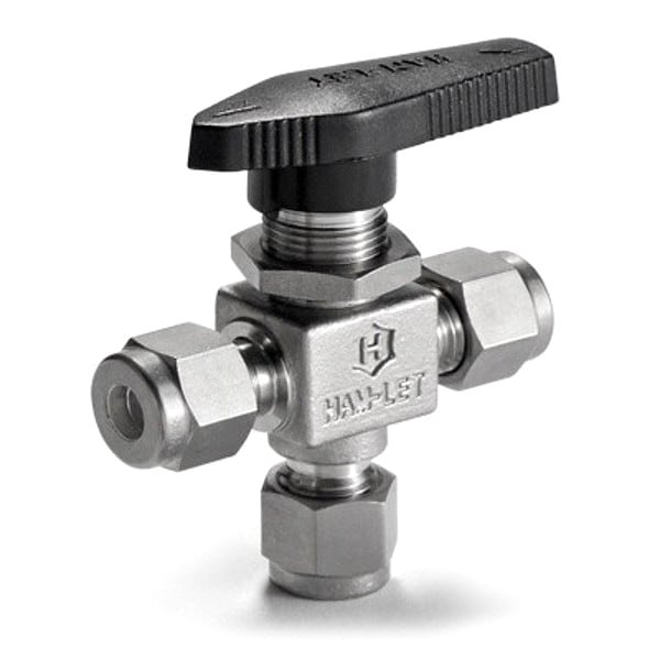 Manual Three-Way Ball Valve, Body Material Stainless Steel, Valve Construction One-Piece, Average Surface Roughness (Ra) Not Applicable, 3-A Standard Compliance Not Rated, Nominal Valve Size 3/8 in, Inlet Connection Size 3/8 in, Inlet Connection Type Compression, ANSI Flange Class Not Applicable, Outlet Connection Type - Side 1 Compression, Outlet Connection Size - Side 2 3/8 in, Outlet Connection Type - Side 2 Compression, Valve Ways 3-Way, Maximum Pressure - Steam Not Rated