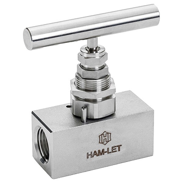 SS Screwed Bonnet Needle Valve, Straight, Body Material 316 Stainless Steel, Pipe Size 1/2 in, FNPT Connection, Stem Type V-Stem, Seal Material PTFE, Length 2 3/5 in, Standards ISO 15848-1, ISO 2006(E)
