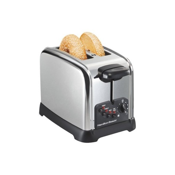 Hamilton Beach, 2 Slice Brushed Stainless Steel Toaster has 2 extrawide slots to easily toast thicker breads like bagels and Texas toast Toast Boost lets you lift smaller breads higher so they're easier to retrieve from the toaster The bagel function toasts bagels for extended time so they're perfectly toasted every time Cleanup is easy too Slideout crumb tray that catches crumbs to keep your countertop clean Automatically shuts off at the end of the toasting cycle, even if toast gets jammed Or stop the toast cycle any time by simply pressing the cancel button Choose from 7 toast shades for lighter or darker toast