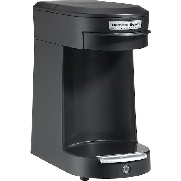Enjoy coffee the way you need it - fast and delicious - with the Hamilton Beach Commercial Single-serve Pod Hospitality Coffee Maker. It combines the convenience of a single-cup coffeemaker with the no-mess ease of coffee pods and excellent coffee extraction. Place pod in basket, fill with water, press to start and enjoy. Coffeemaker brews an 8 oz. cup in less than 3 minutes. Permanent brew basket is easy to remove, rinse and insert back in place. Front-loading design minimizes touching to improve sanitation. Individually wrapped pod holders (sold separately) offer a fresh way to make the coffee or tea you prefer every time. Red indicator light illuminates during brew cycle. Coffeemaker shuts off automatically when brew cycle is complete to save energy and provide peace of mind. It also features an efficient 500-watt heater.