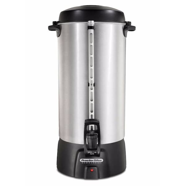 The Proctor-Silex aluminum coffee urn features dual heaters for brewing and gentle warming. Brew anywhere from 20 to 100 cups of hot, fresh coffee. The ready-to-serve light will notify you and your customers when the coffee is ready for service. Guests will appreciate a cup-activated dispenser that makes it easy to fill cups one-handed, perfect for guests juggling plates at the end of a buffet line. If you need to transfer this coffeemaker from the kitchen to the floor, it was designed to be safely moved. The lid locks in place and the handles are cool-to-the-touch. Then at the end of the day this product is easy to clean up. Its lid, brew basket, and stem are all removable, making the cleaning process quick.