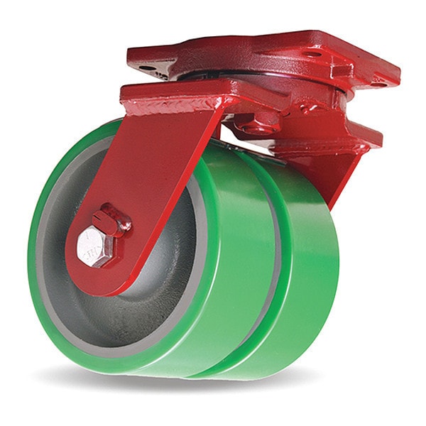 Extra Heavy Duty Dual-Wheel Swivel Caster, 10" x 3" Duralast(R); Polyurethane (95A) on Cast Iron Wheels with 3/4" Precision Tapered Roller Bearings with Dual Wheel Contact Brake