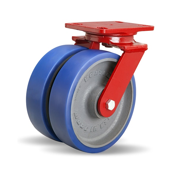 Heavy Service Dual-Wheel Swivel Caster, 8" x 2" Ergo-Glide Polyurethane (85A) on Cast Iron Wheels