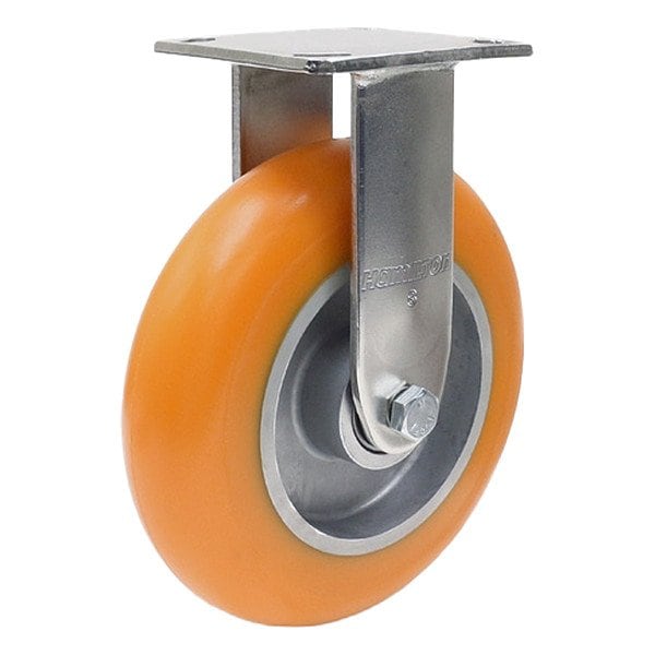 Rigid, Plate Caster, Wheel Dia. 8 in, Wheel Width 2 in, Wheel/Tread Material Polyurethane, Wheel Core Material Aluminum, Non-Marking Yes, Number of Wheels 1, Caster Brake Type Face Brake, Tread Shape Donut