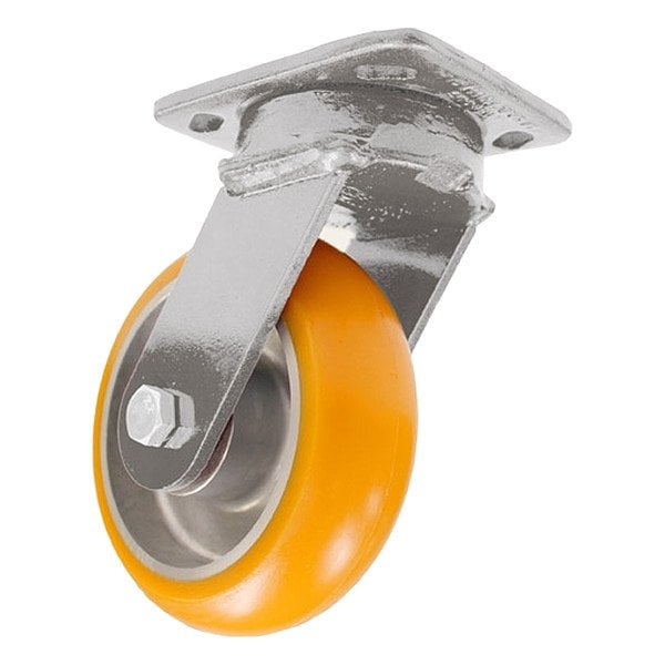 Swivel, Plate Caster, Wheel Dia. 6 in, Wheel Width 2 in, Wheel/Tread Material Polyurethane, Wheel Core Material Aluminum, Non-Marking Yes, Number of Wheels 1, Caster Brake Type Face Brake, Tread Shape Donut