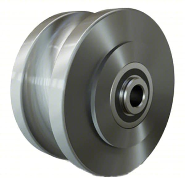 Track Wheel, 4 in Wheel Dia., 2 in Wheel Width, Steel Wheel/Tread Material, Precision Ball Wheel Bearing Type, U-Groove Tread Shape, For Axle Size 1/2 in, 1 1/16 in Groove Width, Yes Includes Spanner Bushing, Steel Wheel Core Material, Yes Non-Marking, 2 1/4 in Hub Length