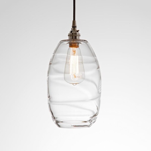 With the Ellisse Mini Pendant, the amazing craftsmen at Hammerton Studio have conjured a clean, composed design perfect for any space. Jumping from the top of the intricate glass, an industrial lamp holder brings this piece together with slick & textured metal details. Contrasting with the ridged metal, the Ellisse's glass shade moves with a long flowing edge created by the path of a molten glass ribbon. Fasten in a vintage Edison bulb (not included - see "Frequently Bought Together") & watch as its glowing filaments lift the glass with rich highlights. The Ellisse Collection Contemporary style Made to Order, Made in the USA, approx. lead time 50 Dimensions: 6.5"W x 6.5"D (adjustable hanging length 14.2" - 132.2"") 1-Light Finish: Flat Bronze, Optic Smoke Shade Bulb(s): E26 Base 40 Watts A19 (not included, see Frequently Bought Together below)