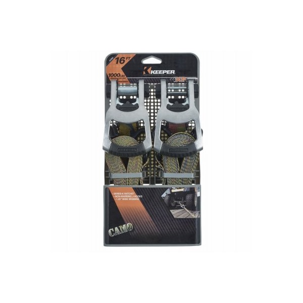 Keeper, K Series, 2 Pack, 114 x 16', Ratchet Tie Down, 114 HiTest Woodland Camo Webbing, Woodland Camo, Aluminum, 1,000 LB Working Load Limit, 3,000 LB Break Strength, Double J Hook With DRing, Strong Aluminum Die Cast Ratchet